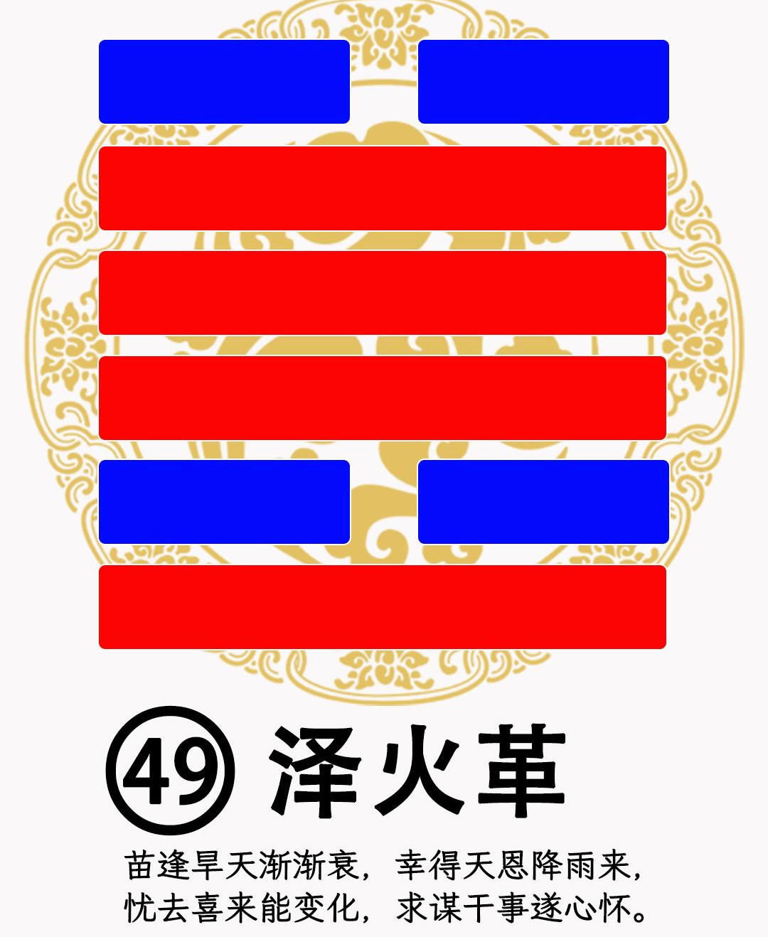 《周易》八卦的本质是透过六十四卦的不同组合,去反应不同的事务的情境变化,以及在特定环境下的人生哲理、每一卦都会有六爻和爻辞,以及三百八十四种对应的状态,透过这些变化可以知道世间万物的运作以及人生的哲理,同时在姓名学上我们也可以借鉴过来结合一起参考《周易姓名》的原理对人生的影响,接下来我们就来详细了解一下周易“泽火革”的卦象涵义和对人生的影响: