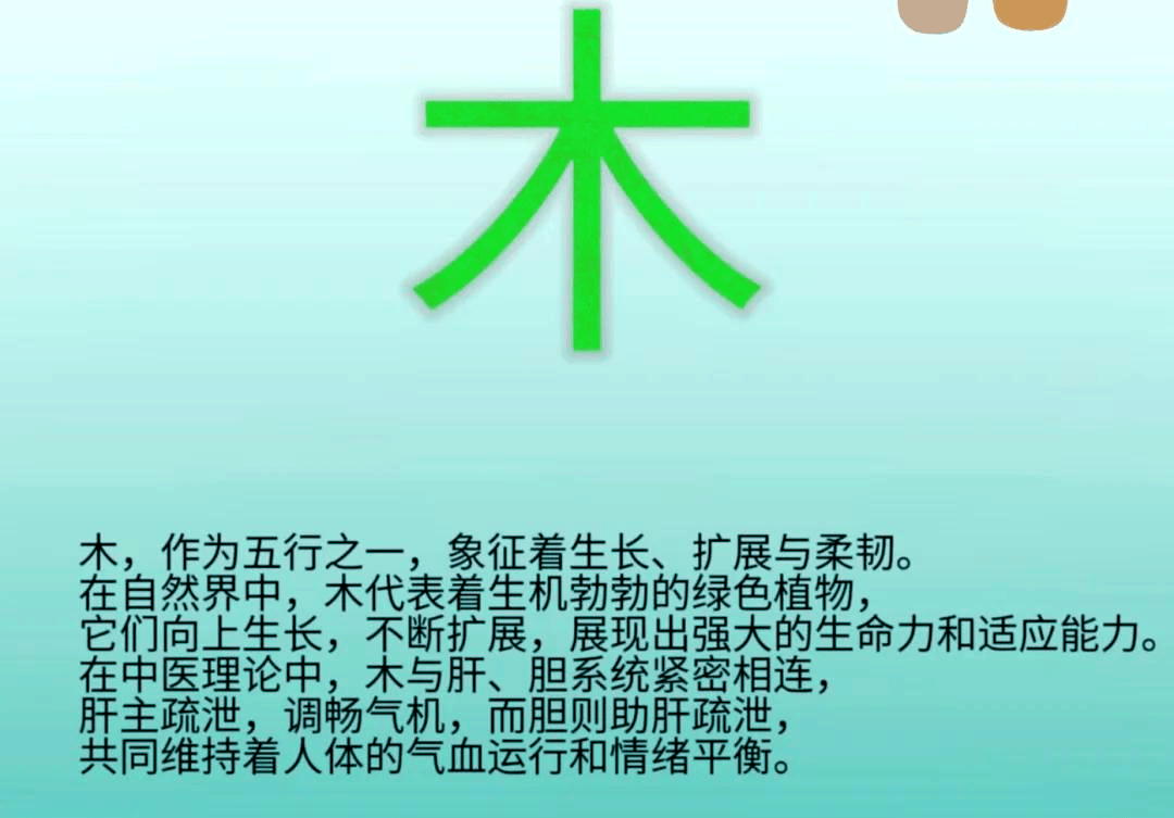 木是中国古代哲学五行之一,分阴阳两属性:甲木为阳,对应胆腑,形态为地上枝叶;乙木为阴,对应肝脏,形态为地下根系 [2]。其代表颜色为绿色、青色,特性为生长、柔和,对应人体特征包括骨骼修长、面色青白等。《黄帝内经》指出木属东方,关联风、酸味、肝脏及筋脉,情绪表现为怒,与人体目窍相关,甲木属少阳之气,通过足少阳胆经将外界阳气输送至体内;乙木属厥阴之气,通过足厥阴肝经将体内阳气输布全身 。