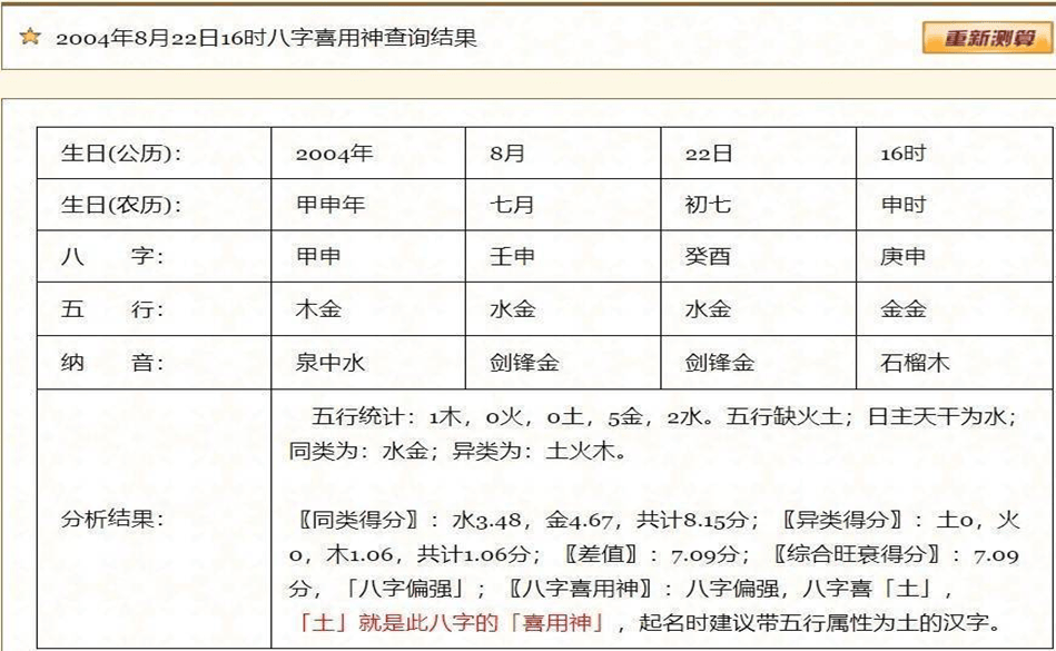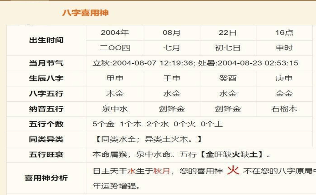 以上就是这个同样的八字,在不同网站所得出的结果,果然是“金水火土”都被当成了喜用神,就差一个木了;