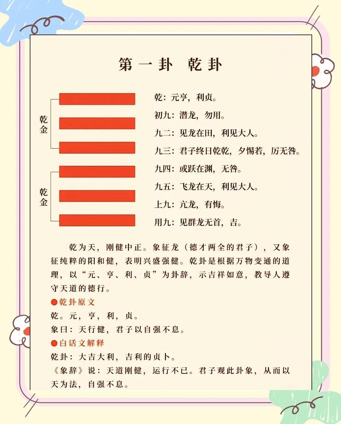 乾卦,象征着天,蕴含着“健”的特质,这种“健”正是乾卦的卦德。在《周易集解》中,它被解释为:“天之体以健为用,运行不息,应化无穷,故圣人则之。”这意味着,乾卦不仅代表着天体的永恒运动,更象征着一种积极向上、永不停止的精神。
