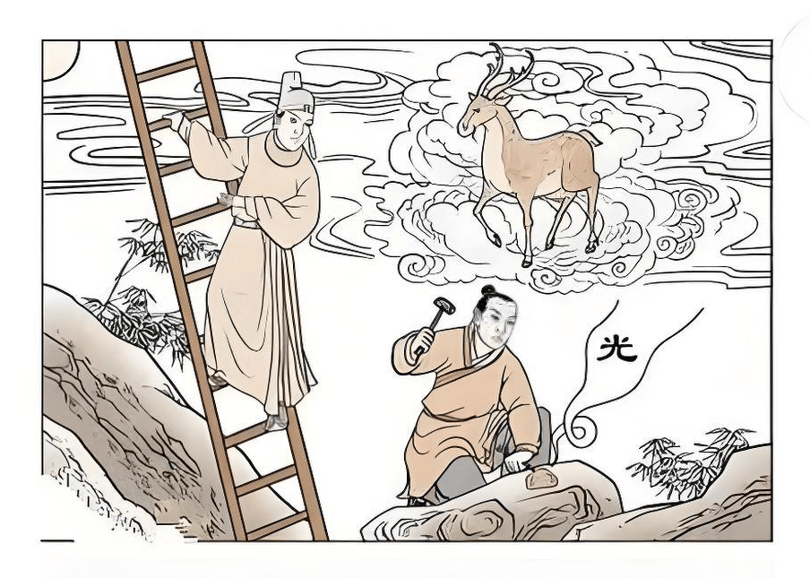 乾封之象图中有一鹿在云中象征天禄;巨石上有一块王,被射着光芒,一匠人在琢玉,去其表可见宝;明月当空,一片光明,有一位读书人登云梯望月,是想折月官丹桂。这是六龙行天之卦,包容万象。