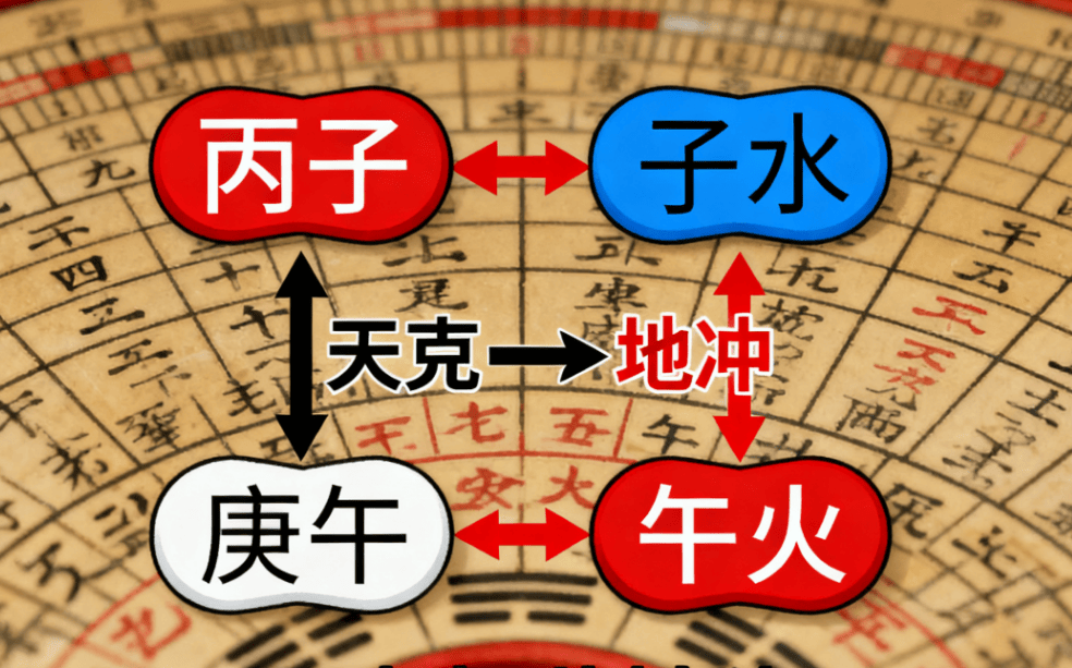 在八字命理中,“天克地冲”指流年天干与日柱天干相克,同时流年地支与日柱地支相冲,形成双重冲击。2026年为丙午年,若日柱为庚子,则构成“天克地冲”格局:天干丙火克庚金,地支午火冲子水。这种格局象征五行能量剧烈碰撞,易引发生活各领域的波动与挑战,需谨慎应对。